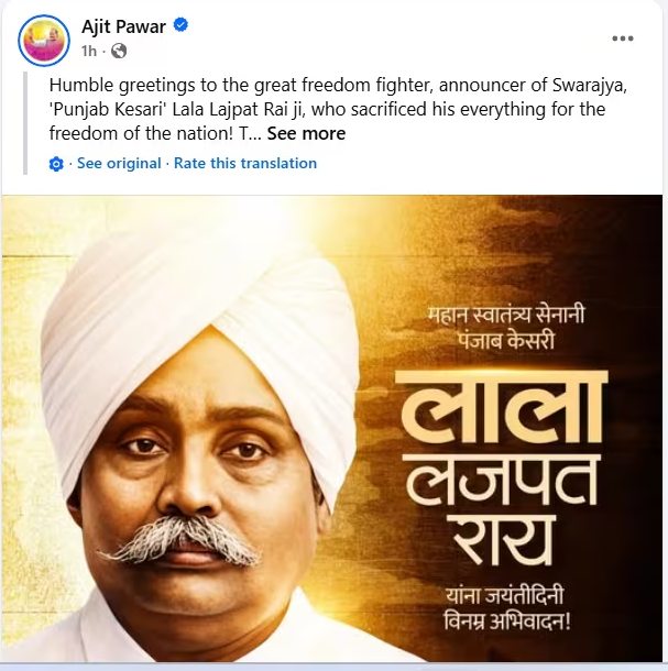 ಮುಂಬೈ: ವಿಮಾನ ದುರಂತದಲ್ಲಿ ನಿಧನರಾದ ಅಜಿತ್ ಪವಾರ್ ಸೋಷಿಯಲ್ ಮೀಡಿಯಾದಲ್ಲಿ ಸ್ವಾತಂತ್ರ್ಯ ಹೋರಾಟಗಾರರಾದ ಲಾಲ ಲಜಪತ್ ರಾಯ್ ಅವರ ಜನ್ಮದಿನವನ್ನು ನೆನಪು ಮಾಡಿಕೊಂಡು, ಲಾಲ ಲಜಪತ್ ರಾಯ್ ನಮ್ಮ ದೇಶದ ಸ್ವಾತಂತ್ರ್ಯಕ್ಕಾಗಿ ಎಲ್ಲವನ್ನೂ ತ್ಯಾಗ ಮಾಡಿದ್ದಾರೆ. ಅವರ ದೇಶಭಕ್ತ ಮನೋಭಾವ ಯಾವಾಗಲೂ ಜನತೆಗೆ ಸ್ಪೂರ್ತಿಯನ್ನು ತುಂಬುತ್ತದೆ ಎಂದು ಅಜಿತ್ ಪವಾರ್ ಪೋಸ್ಟ್ನಲ್ಲಿ ಬರೆದುಕೊಂಡಿದ್ದರು, ನಂತರ ಈ ಪೋಸ್ಟನ್ನು ರಿಮೋವ್ ಮಾಡಲಾಗಿತ್ತು.