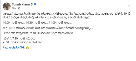 - ಸುರೇಶ್ ಕುಮಾರ್ ಅವರ ಪ್ರತಿಕ್ರಿಯೆ: ಬಿಜೆಪಿ ಶಾಸಕ ಎಸ್. ಸುರೇಶ್ ಕುಮಾರ್ ಅವರು ಈ ಕುರಿತು ಸಾಮಾಜಿಕ ಜಾಲತಾಣದಲ್ಲಿ ಪೋಸ್ಟ್ ಹಂಚಿಕೊಂಡಿದ್ದು, ಸಿದ್ದರಾಮಯ್ಯ ಅವರು ಬಜೆಟ್ ಮಂಡಿಸಲು 10:15 ಸಮಯವನ್ನೇ ಏಕೆ ಆರಿಸಿಕೊಂಡರು ಎಂಬ ಗುಟ್ಟನ್ನು ಬಿಟ್ಟುಕೊಟ್ಟಿದ್ದಾರೆ.