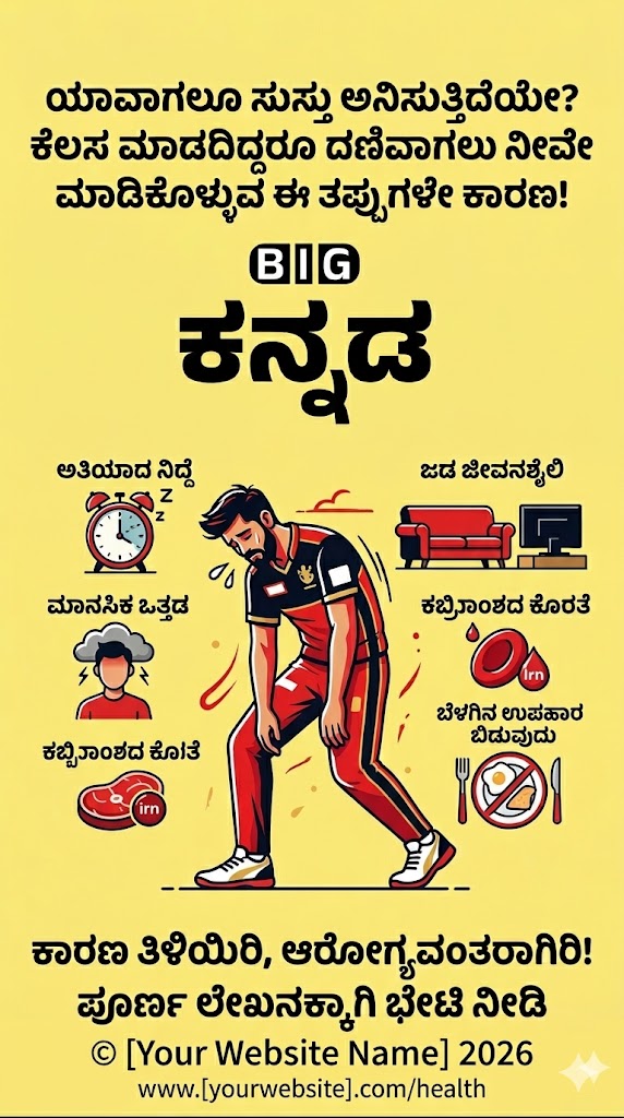 ತೀರ್ಮಾನ: ಸುಸ್ತು ಎನ್ನುವುದು ಕೇವಲ ಕೆಲಸದ ಫಲವಲ್ಲ, ಅದು ನಿಮ್ಮ ದೇಹವು ವಿಶ್ರಾಂತಿ ಅಥವಾ ಪೋಷಕಾಂಶಗಳನ್ನು ಕೇಳುತ್ತಿರುವ ಸಂಕೇತ. ಮೇಲಿನ ಕಾರಣಗಳಲ್ಲಿ ನಿಮ್ಮ ಅಭ್ಯಾಸಗಳೂ ಅಡಗಿರಬಹುದು. ಜೀವನಶೈಲಿಯಲ್ಲಿ ಸಣ್ಣ ಬದಲಾವಣೆ ಮಾಡಿಕೊಂಡರೆ ಆಶ್ಚರ್ಯಕರ ರೀತಿಯಲ್ಲಿ ನಿಮ್ಮ ಶಕ್ತಿಯ ಮಟ್ಟ ಹೆಚ್ಚಾಗುವುದನ್ನು ನೀವು ಗಮನಿಸಬಹುದು. ಒಂದು ವೇಳೆ ನಿರಂತರವಾಗಿ ಸುಸ್ತು ಕಾಡುತ್ತಿದ್ದರೆ ವೈದ್ಯರ ಸಲಹೆ ಪಡೆಯುವುದು ಉತ್ತಮ.