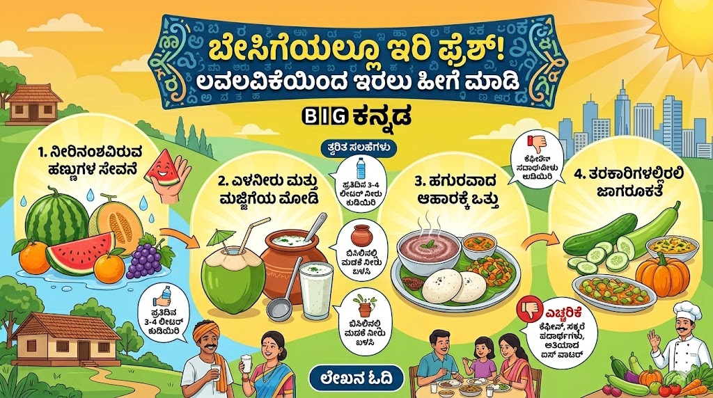ಸೂರ್ಯನ ಪ್ರತಾಪ ದಿನದಿಂದ ದಿನಕ್ಕೆ ಹೆಚ್ಚುತ್ತಿದೆ. ವಿಪರೀತ ಬೆವರು, ಸುಸ್ತು ಮತ್ತು ನಿರ್ಜಲೀಕರಣ (Dehydration) ಈ ಕಾಲದ ಸಾಮಾನ್ಯ ಸಮಸ್ಯೆಗಳು. ಆದರೆ ನಾವು ಸೇವಿಸುವ ಆಹಾರದಲ್ಲಿ ಸ್ವಲ್ಪ ಬದಲಾವಣೆ ಮಾಡಿಕೊಂಡರೆ, ಈ ಬೇಸಿಗೆಯನ್ನು ಆರಾಮವಾಗಿ ಕಳೆಯಬಹುದು.